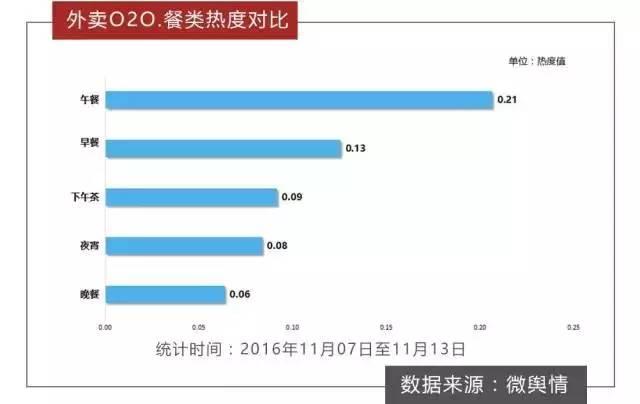 從用戶的訂餐喜好來看,在外賣O2O平臺提供的正餐中,午餐最受網(wǎng)友關注,熱度值為0.21。