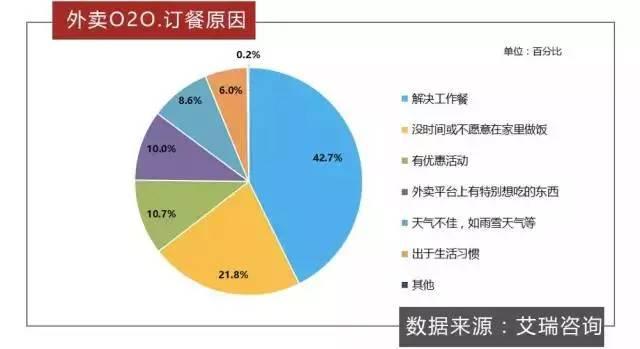 而關于選擇外賣O2O的原因,42.7%的用戶點外賣是為了解決工作餐;21.8%的用戶是由于沒時間或不愿在家做飯;近一成的用戶是因為有優(yōu)惠活動或外賣平臺上有特別想吃的餐品,8.6%的用戶是由于天氣不佳,也有6.0%的用戶表示外賣O2O已經(jīng)成為了他們的生活習慣。