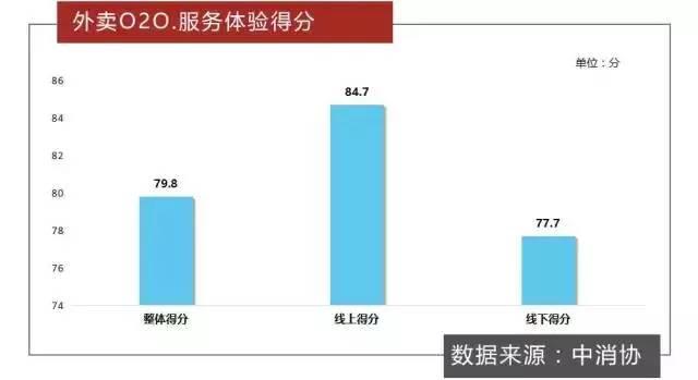 根據(jù)中國消費者協(xié)會對外賣O2O服務體驗的調(diào)查結果顯示:外賣O2O服務整體得分為79.8分,其中線上體驗得分為84.7分,線下體驗得分為77.7分。這說明相對于線上訂餐的體驗情況,線下送餐服務及送餐質(zhì)量體驗部分存在的問題相對突出。