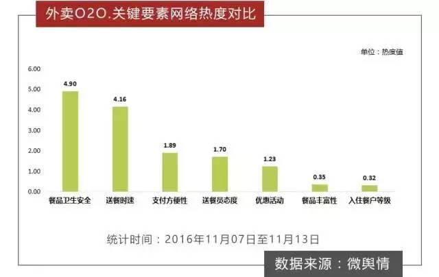 此外,根據(jù)數(shù)據(jù)統(tǒng)計,在外賣O2O的幾大要素中,“餐品衛(wèi)生安全”和“送餐時速”的網(wǎng)絡熱度值相對較高,這也在側面說明網(wǎng)友對外賣O2O的“安全”和“時速”更為關注。